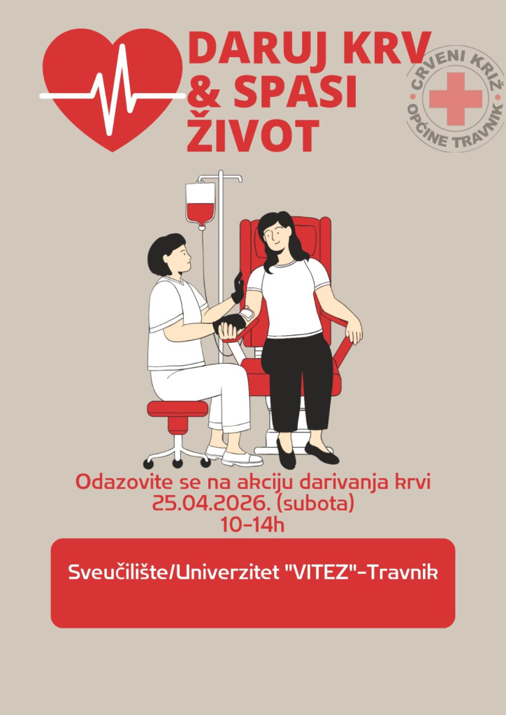 Crveni križ općine Travnik u saradnji sa Sveučilište/Univerzitet “VITEZ” Travnik organizira akciju dobrovoljnog darivanja krvi koja će se održati u subotu, 25. aprila 2026. godine, u terminu od 10:00 do 14:00 sati, u prostorijama Sveučilišta/Univerziteta “VITEZ” Travnik.